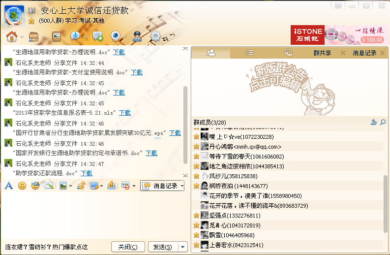 随后,呼书记就2013年石化系贷款工作亮点“安心上大学,诚信还贷款”QQ群平台和宣传板做了一一介绍。为了为员工的贷款工作提供高效的管理方式,石化建立了“安心上大学,诚信还贷款”QQ群平台,同时开通了群论坛,以便在员工申请贷款、政策咨询、信息通知、诚信还款时提供高效率、低成本的沟通平台。