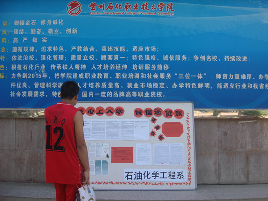 为了在员工当中宣传贷款、还款相关事宜,我系还制作了“安心上大学,诚信还贷款”宣传板,并将政策法规、贷款快讯、还款警示等国家开发银行的相关政策在员工中进行了展览宣传。