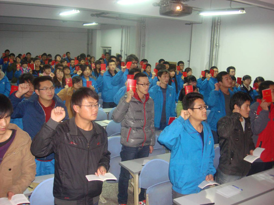 接下来是申请入党代表宣读入党申请书;宣读完后,由入党介绍人介绍申请入党人的主要情况,入党介绍人由党员教职工和员工党员组成,他们对其能否入党表明了自己的意见。这些申请入党的员工,经过现场的无计名投票表决全部通过,并且新党员代表诚恳的向组织陈述自己的入党志愿。最后进行大会第三项议程:党员代表领取《中国共产党章程》手册,并由李胜泥老师组织全体员工学习《中国共产党章程》,最后,全体新党员宣读入党誓词。至此,大会所有议程全部结束。
