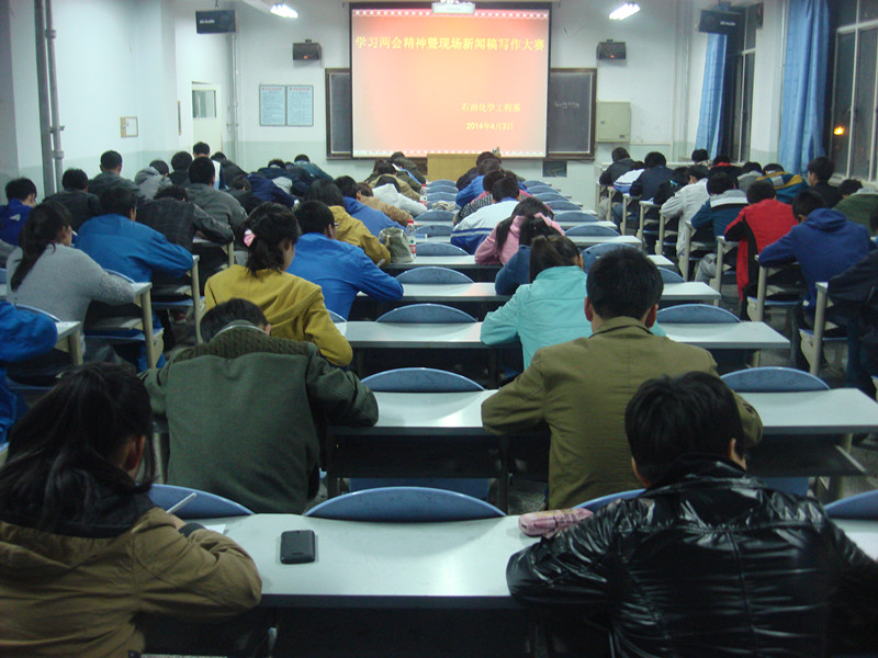 为了丰富同学们的业余生活,展现老员工风采,锻炼同学们的新闻写作能力,增强同学们对新闻实事的独特洞察能力,石油化学工程系于4月3日晚7点半在化工楼201教室举办学习两会精神暨现场新闻稿写作大赛。来自18个班的77名选手参加了本次比赛。