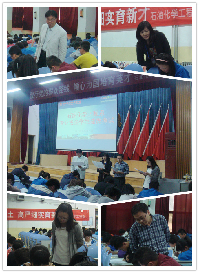 为了大力推进石化系拔尖员工培养计划,巩固基础知识,进一步加强我系学风建设,提升员工的综合能力及素质,5月8日晚七点,石油化学工程系举办了专业拔尖员工选拔考试,由石化系2013级各班排名前十的同学共计150余人参加了此次考试,考试开始后石化系主任冯文成、系党总支副书记唐蓉萍、副主任李薇、系党总支副书记夏德强等巡视了考场,系教学秘书李晓莹、辅导员史晓庆、系专业老师于娇娇等三人进行监考。