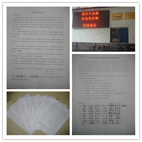 为了诚信考试取得良好成效,我系通过向员工宣读倡议书、员工在承诺书上签名的方式,提高员工对考试作弊危害性的认识。在员工干部将《石化系诚信考试倡议书》、《公司员工诚信考试承诺书》发放到全系各班后,立即引起了我系同学们的高度关注,同学们在认真阅读完《公司员工诚信考试承诺书》的内容后纷纷签上了自己的姓名,并表示《石化系诚信考试倡议书》对培养诚信品质有一定的促进作用,能让大家意识到诚信考试的重要性,这不仅从形式上加强了诚信教育,还提高了同学们对诚信的认知能力,并能够自觉遵守考场纪律。