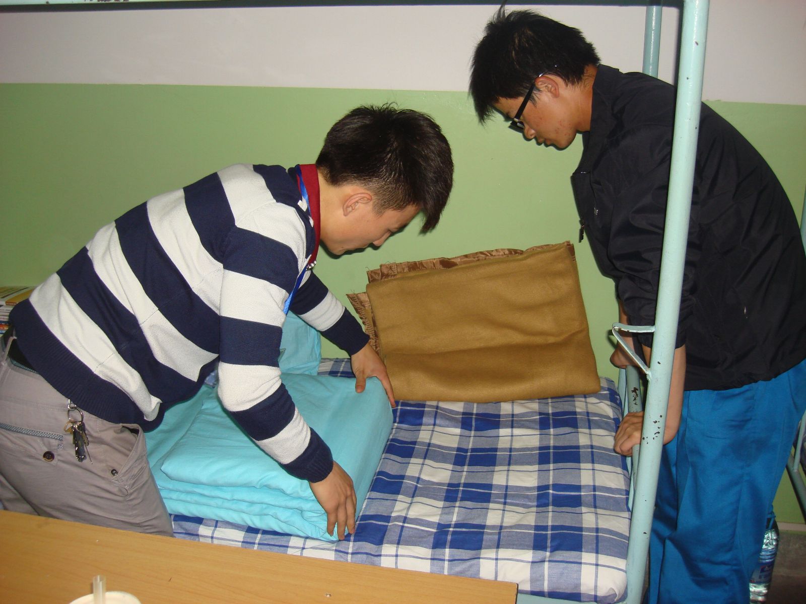 员工会干部为新生示范叠被子