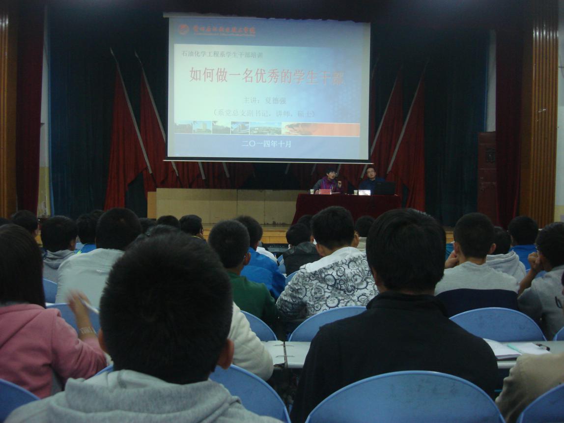 10月22日晚,石油化学工程系在西阶一举办题为《如何做一名优秀的员工干部》的培训讲座。石化系党总支副书记夏德强担任主讲,石化系员工管理的三支队伍之一员工干部队伍共300余人参加了本次讲座。