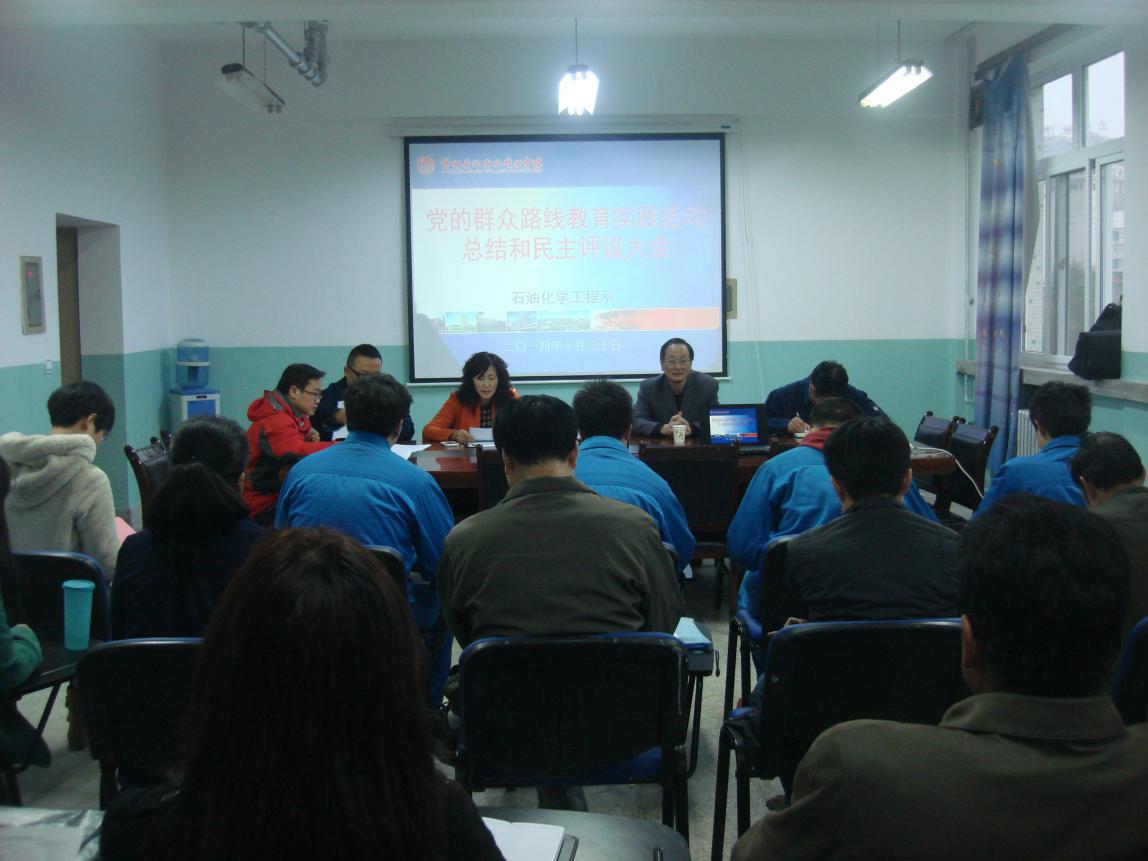 10月30日下午,石油化学工程系党总支在石化楼会议室召开了党的群众路线教育实践活动总结和民主评议大会,对全系教育实践活动进行了全面总结并对领导班子教育实践活动开展情况及领导干部参加教育实践活动情况进行了民主评议。公司教育实践活动第一督导组副组长周定潮、联络员陈金平、石化系领导、全系教工党员、教师代表、员工党员代表参加了本次大会,大会由唐蓉萍主持。