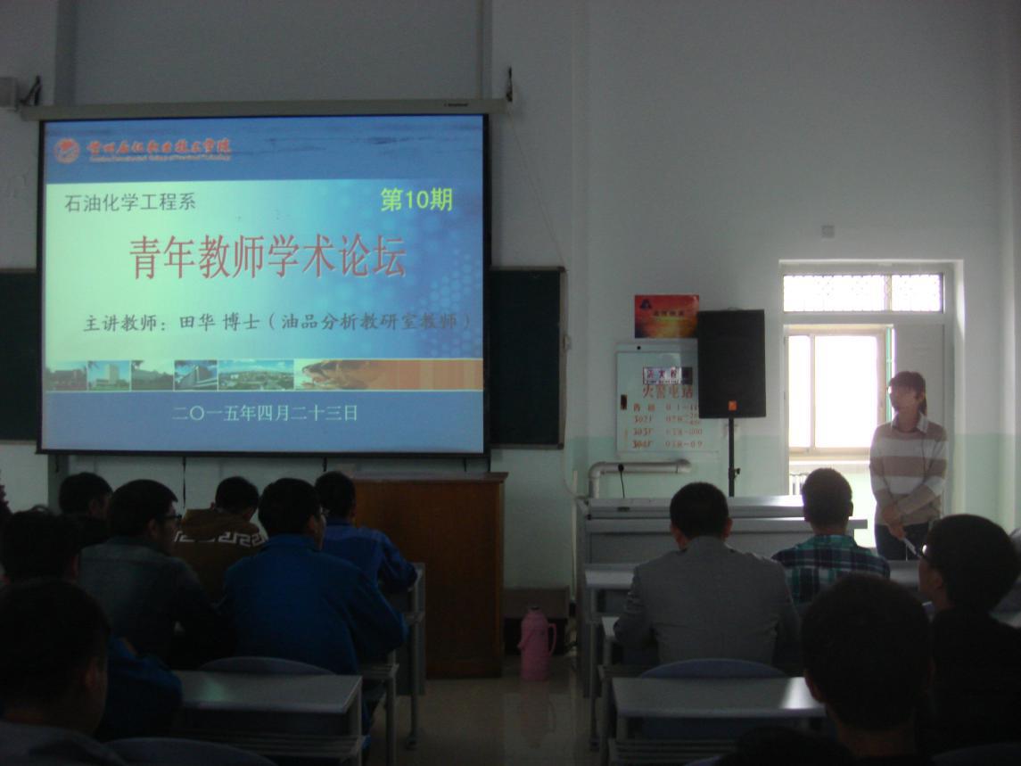 4月23日下午,石油化学工程系在西阶三教室举办了第十期青年教师论坛,油品分析教研室教师田华博士做了题为“原油中重金属元素的检测方法”的报告,石化系师生150人参加了本次论坛。