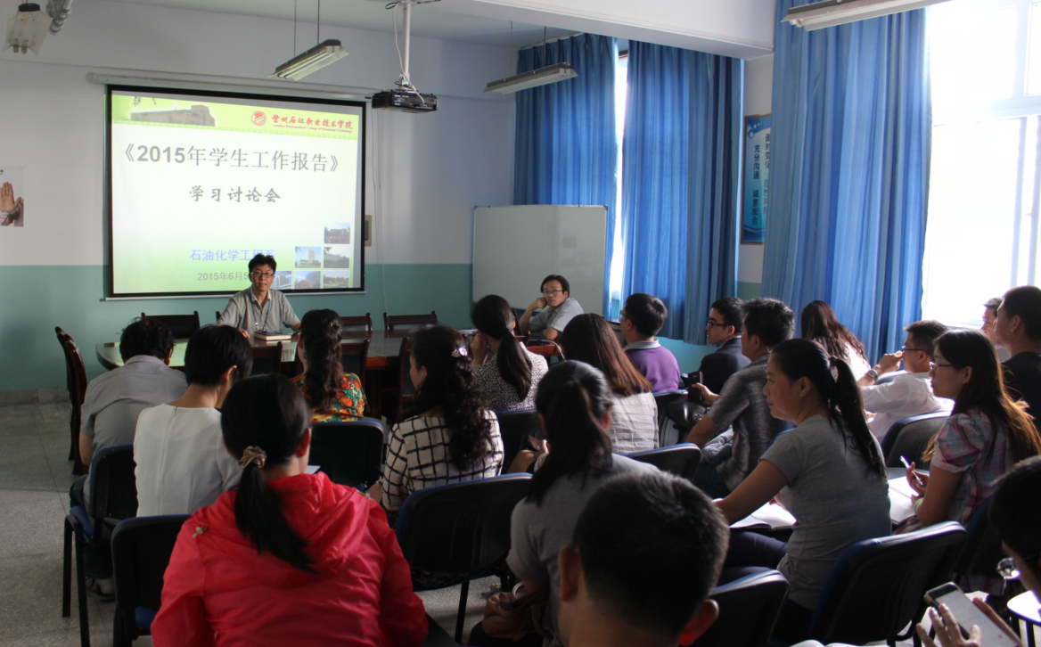 根据2015年度员工工作会议日程安排,石化系于6月5日下午16:30在石化楼三楼会议室举行《2015年员工工作报告》学习讨论会,系主任、系副书记、团总支书记,教工党支部书记,教研室主任,全体辅导员、班主任等参加了会议。系主任冯文成主持了本次会议。