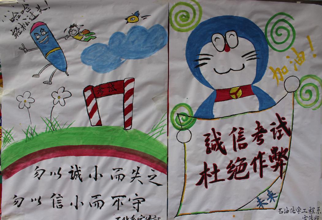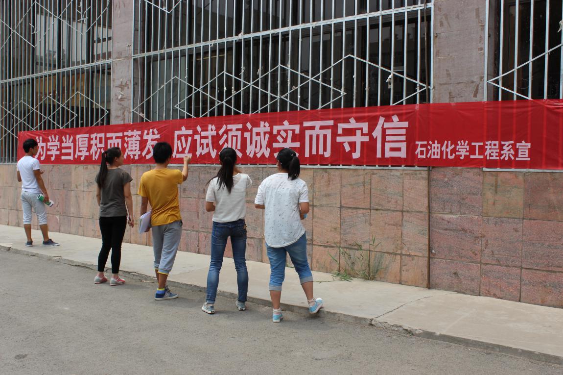 石化系了利用海报、条幅宣传“为学当厚积而薄发,应试须诚实而守信”的应考规则,告诫同学们“车无辕而不行,人无信则不立”考试不仅是一次学习成果的检阅,同时也是一场道德与诚信的考验,要求员工坚持“以诚信考试为荣,以违纪作弊为耻”的应试作风。并召开班主任会议,传达了院系对诚信考试的高度重视,要求班主任利用团生活的时间召开以“诚信考试”为主题的团生活。班主任通过讲述真实的考试作弊案例,告诫同学们要“坦坦荡荡做人,本本分分考试”,通过因为考试作弊而被处分,以至于影响以后就业的员工例子,让同学们清楚地认识到了考试作弊的具体危害和严重后果,要求同学们应提前做好复习工作,希望他们能在考场上用自己的实力考出一份令人满意的答卷。