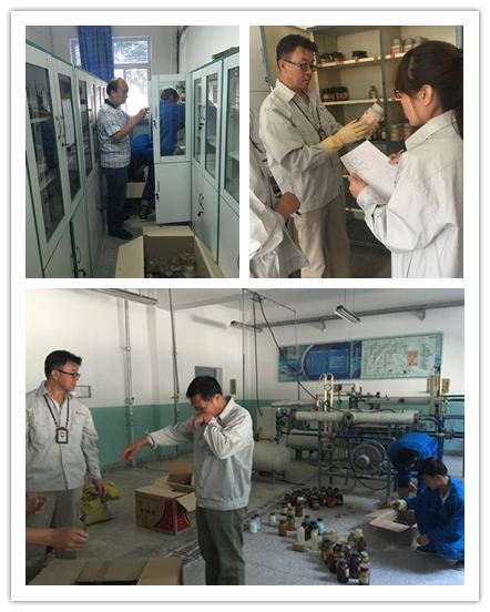 为全面掌握石化楼库存化学试剂情况,保证化学试剂及药品的安全存放,优化整合现有资源,8月21到8月24日各教研室对实训室库房药品进行全面整理和登记,在此基础上,石化系于8月25日,由系主任冯文成牵头,系领导、各专业带头人及库房管理人员参与,对石化系1楼库房存放化学试剂进行清点整理,按危险程度分类存放,重新制作标签。