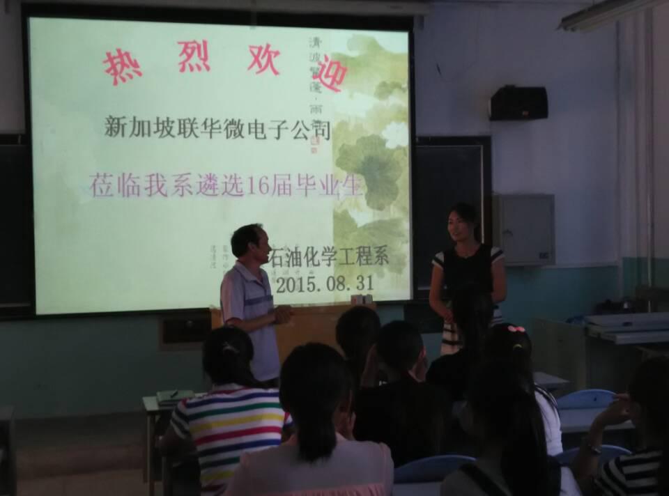 2015年8月31日下午4点,新加坡联华微电子公司人力资源部杨丽女士,到石油化学工程系石化楼201多媒体教室举行了企业招聘宣讲报告会,并有意向遴选2016届毕业生,石化系、应化系、信控系等相关专业的60余名员工参加了招聘会。