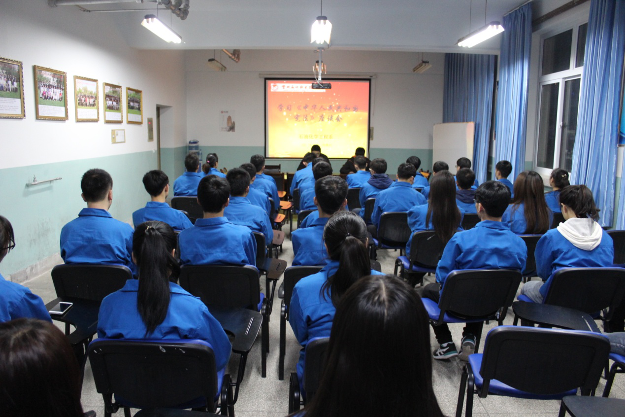 为使广大同学更加深入的了解和学习宪法知识,弘扬宪法精神,增强法制观念,12月7日晚,在12月4日第二个宪法日之后,石油化学工程系于化工楼309会议室组织开展了学习《中华人民共和国宪法》。石化系员工会干部和14、15级各班班委约60人参加了本次会议。