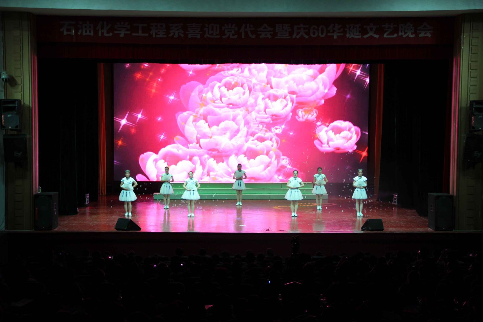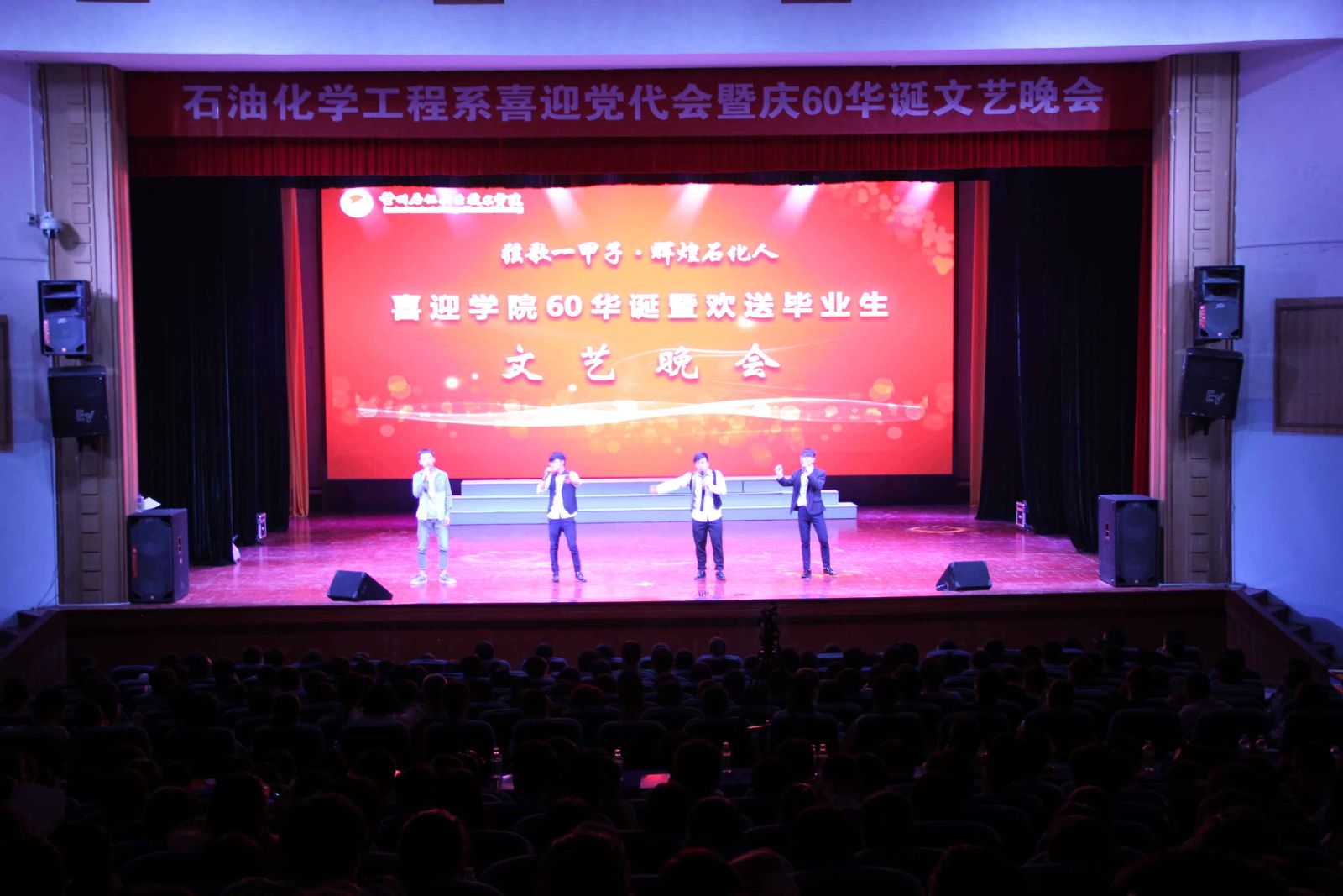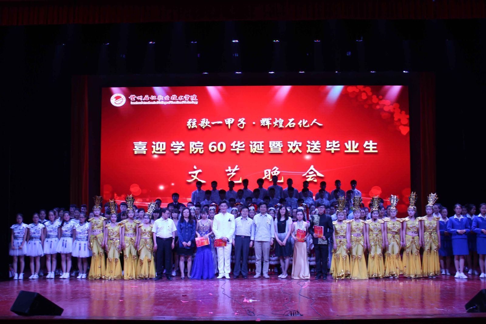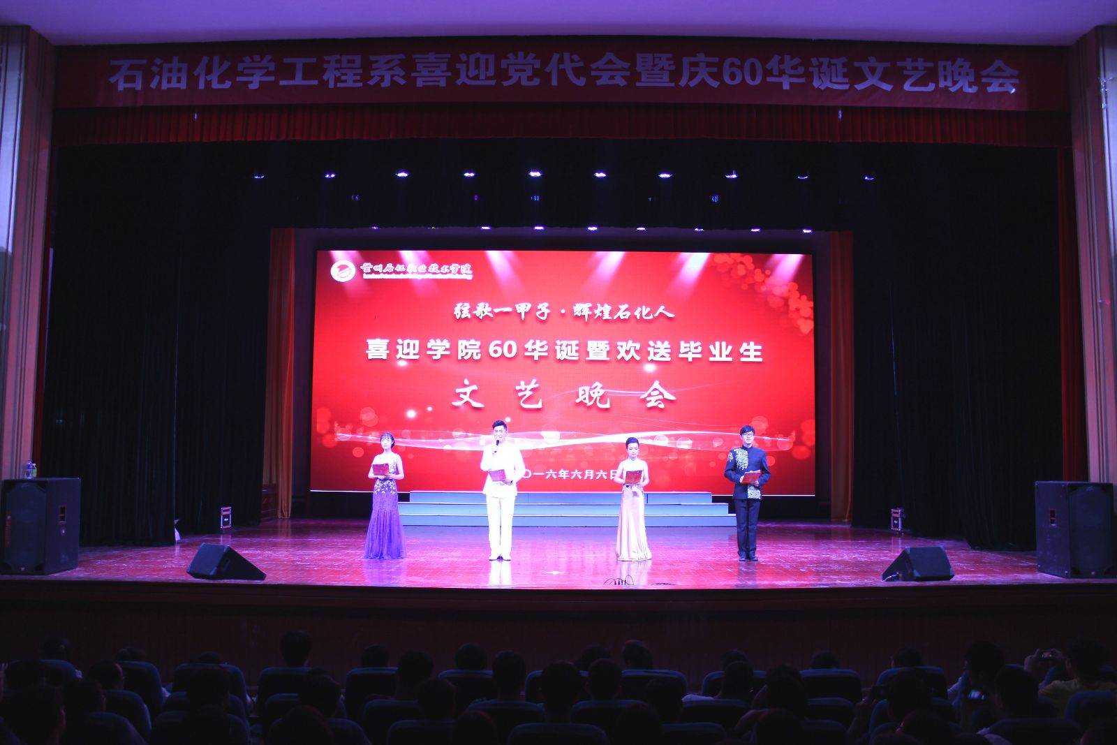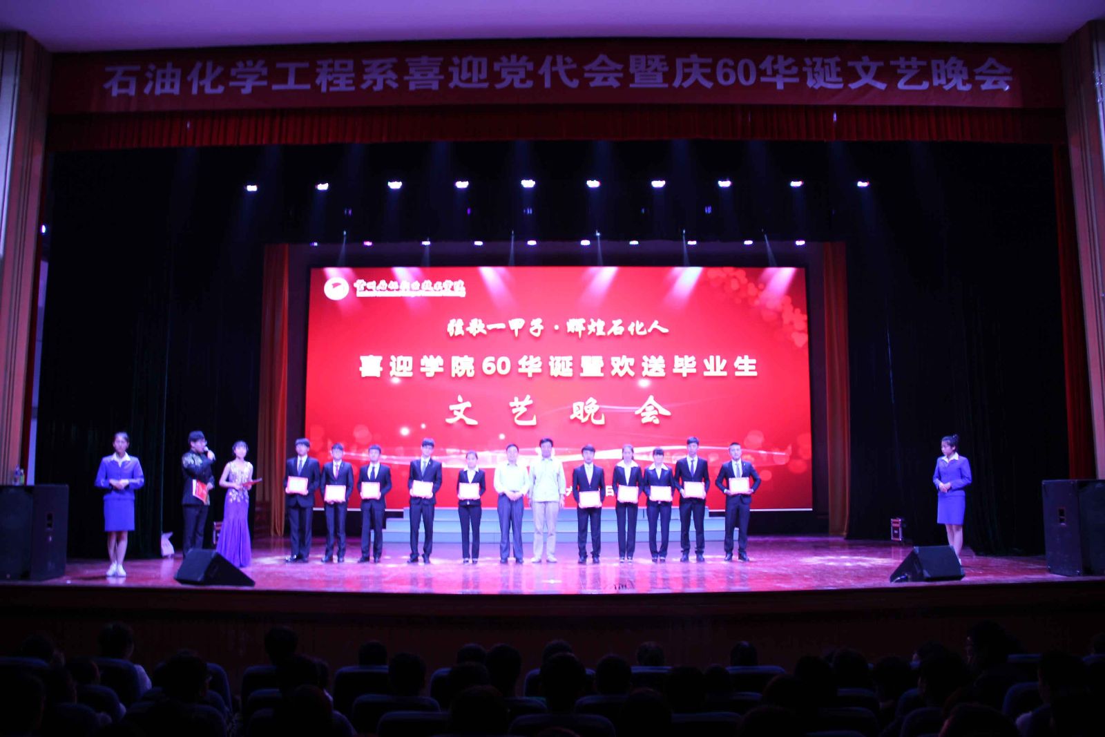 人近花甲尽享福寿满堂,校满六十喜看桃李芬芳。6月6日晚,石油化学工程系“喜迎党代会、欢庆公司60华诞暨欢送毕业生”主题文艺晚会在东区礼堂成功举办。公司领导、石化系教职工及石化系和其他各系1300余名同学观看了此次演出。