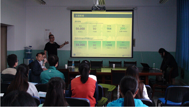 会上,王总经理首先通过PPT展示了公司的基本风貌,让同学们对公司有了大概的了解。接着,他又对公司的发展历程、文化理念、科技研发、公司在华主要业务分布、各分公司生产现状等方面作了详细的介绍。法国液化空气集团是全球工业与医疗保健气体、技术和服务领域的领导者,业务遍及80个国家,员工逾50,000人,为超过200万名客户与患者提供服务。自1902年成立以来,集团始终将氧气、氮气和氢气作为其核心业务,其宏伟目标是成为实现长期业绩并履行企业责任的行业领导者。液化空气集团于1916年进入中国,经过十多年业务的加速发展,目前在中国设有近90家工厂,遍布40多个城市,拥有约4,500名员工。其在华主要经营范围包括:工业及医用气体的运营,及由其全球工程技术业务单元所开展的工程技术业务。公司业务已覆盖中国重要的沿海工业区域,并继续向中部、南部和西部地区拓展。宣讲会最后,王总经理与同学们进行了交流互动,对同学们提出的工资待遇和食宿问题给出了满意回答。
