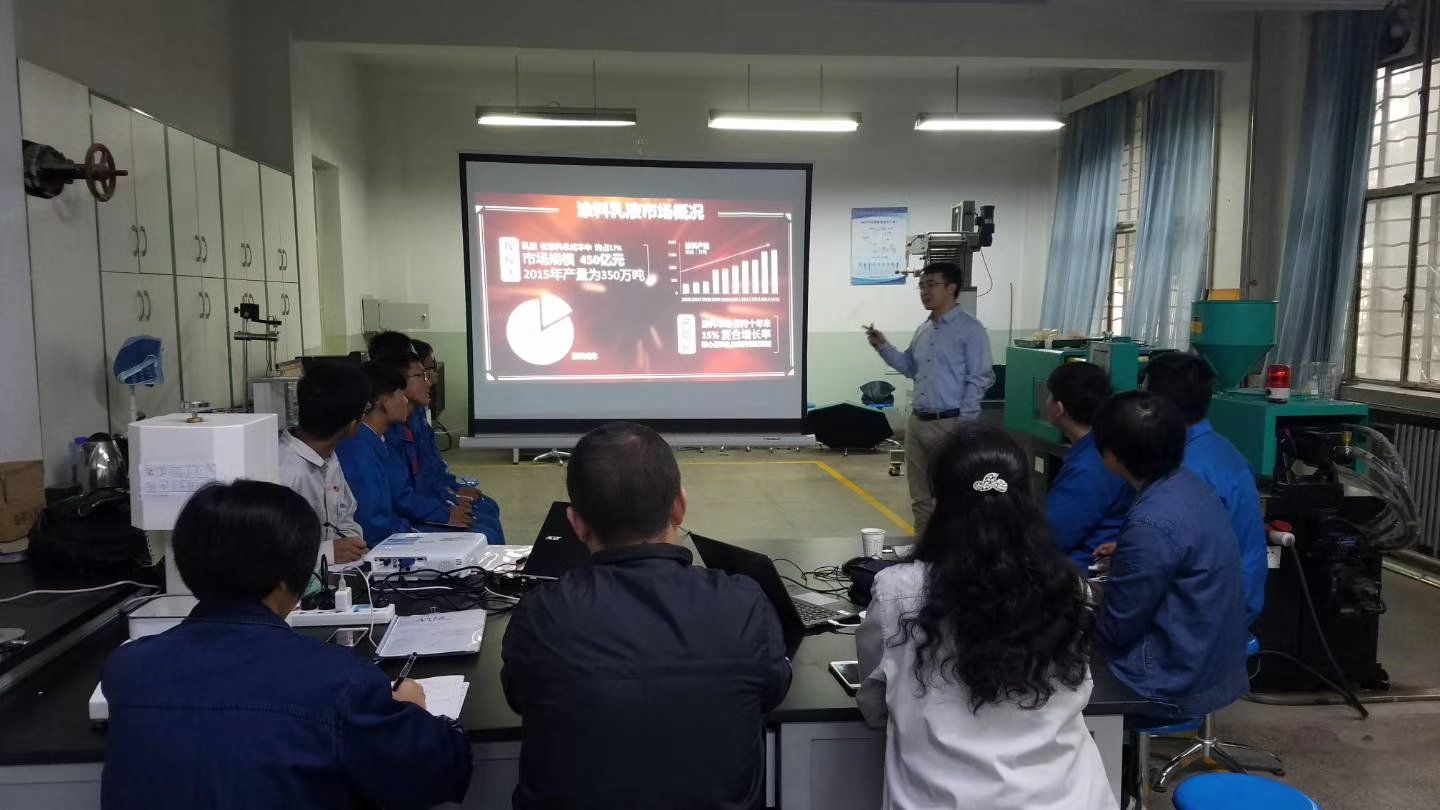 上午,梁旭教授首先来到石化楼,与公司领导就公司建设和学科发展深入交换了意见。紧接着,梁旭教授来到位于第一工业中心的高分子合成技术专业实训基地进行考察交流。考察之时,恰逢高分子专业教师正在指导即将参加全国高分子材料行业大赛的员工进行技能训练。梁教授在专业教师的陪同下,首先参观了高分子合成、高分子材料成型加工、高分子材料性能测试等项目的实训室,对实训环境建设及实训项目开设的完备程度,他连连表示赞叹。随后,梁教授与在场的老师和同学们进行了座谈,就高分子专业如何深入发展、教学科研工作如何更好地推进、科研成果如何有效地进行产业化转化等问题作了交流,其中着重探讨了新型涂料乳液的合成及应用问题。梁教授在江苏镇江兼任凯库勒纳米新材料有限公司的技术总监,他表示,公司高分子合成技术专业具有非常优秀的教学资源,在此条件下培养出来的员工,一定具备扎实的理论功底和实操技能,他代表企业热烈欢迎每一位从高分子合成技术专业毕业的员工前往就业。