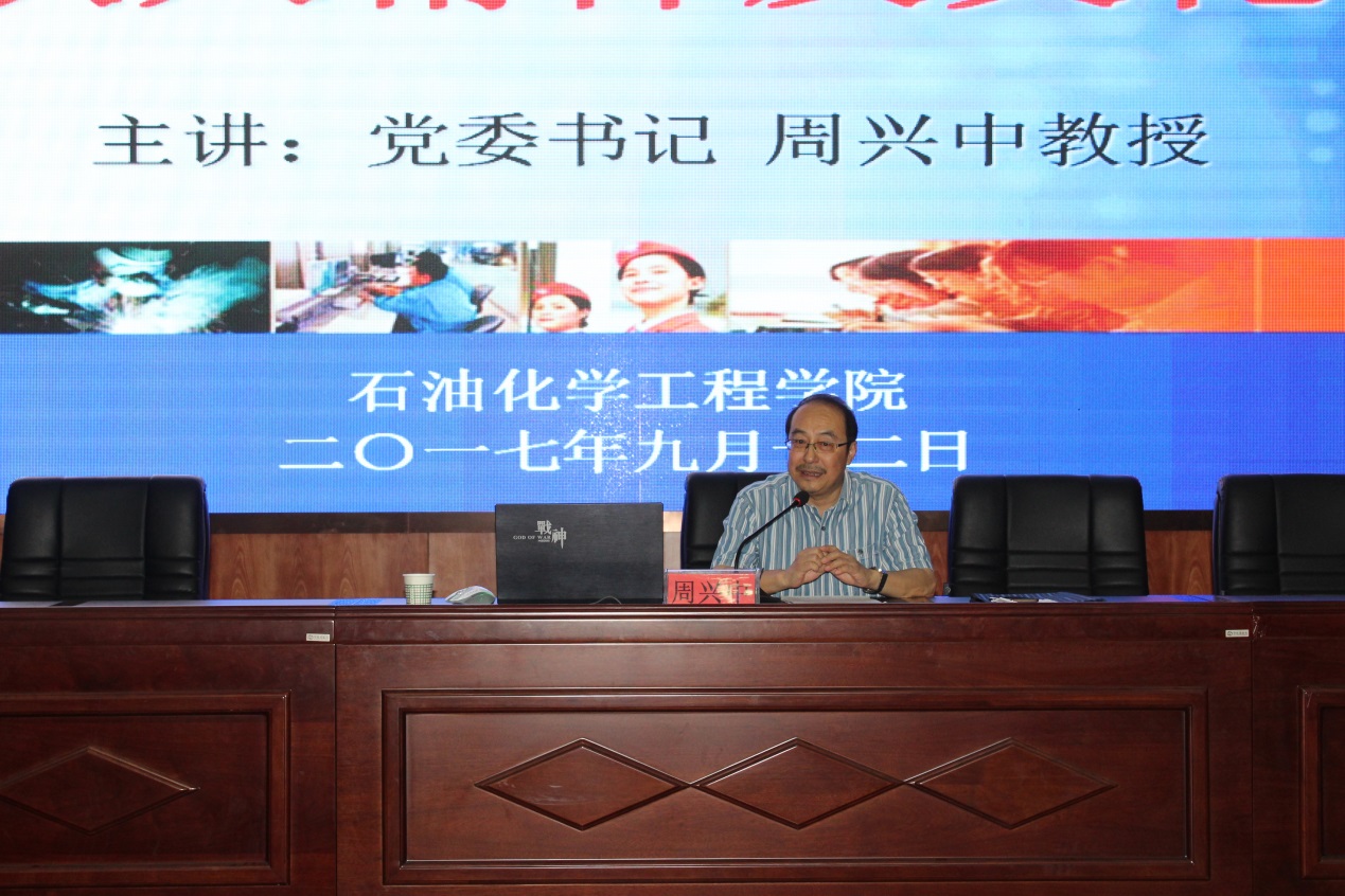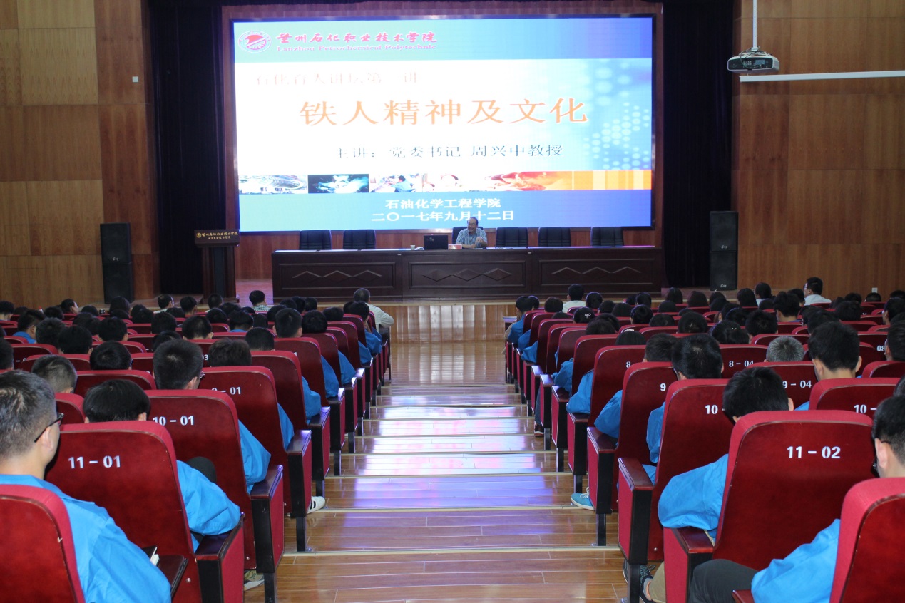 9月12日晚,“石化育人讲坛”第一讲在西区报告厅开讲,公司党委书记周兴中担任主讲嘉宾,为全体师生党员、入党积极分子、员工干部等近400人做了 “铁人精神及文化”主题报告。