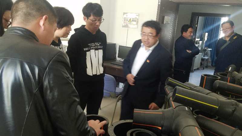 进入公司厂区,张吉庆总经理首先带领教师一行到燃气管道生产车间,参观挤出工艺生产高密度聚乙烯燃气管道的生产线。生产线设备全部是来自德国克劳斯马菲公司的进口设备,设备先进,自动化程度高,工艺控制精确,能耗低。张总经理一路沿着生产线,细致地向老师们讲解了原料处理、设备操作、工艺控制指标和产品参数;随后又走进管道性能检测中心,讲解了各类管道热力学性能的测试仪器和方法。整个参观过程使老师们的专业知识与生产实际紧密对接,极大地提升了老师们的专业能力。