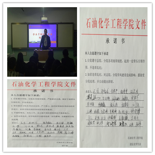会议上,团学负责人首先为大家解读了公司的员工管理工作制度、共青团工作制度等。随后他着重强调了以下几点:1.高校员工干部是公司领导联系员工的桥梁和纽带,是公司开展员工工作的得力助手;2.员工干部应贯彻、落实、执行公司的各项决定,代表员工参与员工参与公司的教育和管理事务,维护员工的合法权益;3.员工干部应积极协助公司加强校风校纪的建设,带头遵守公司的各项规则制度,维护公司正常的管理秩序,建设良好的学习、生活环境;4.员工干部时员工中的先进分子,是员工学习、工作、生活的楷模,在日常的学习、工作、生活中,应关心同学、热心为同学服务,不允许有任何凌驾于员工之上的言行。 最后,所有团学干部及班级员工干部自愿签订了承诺书。