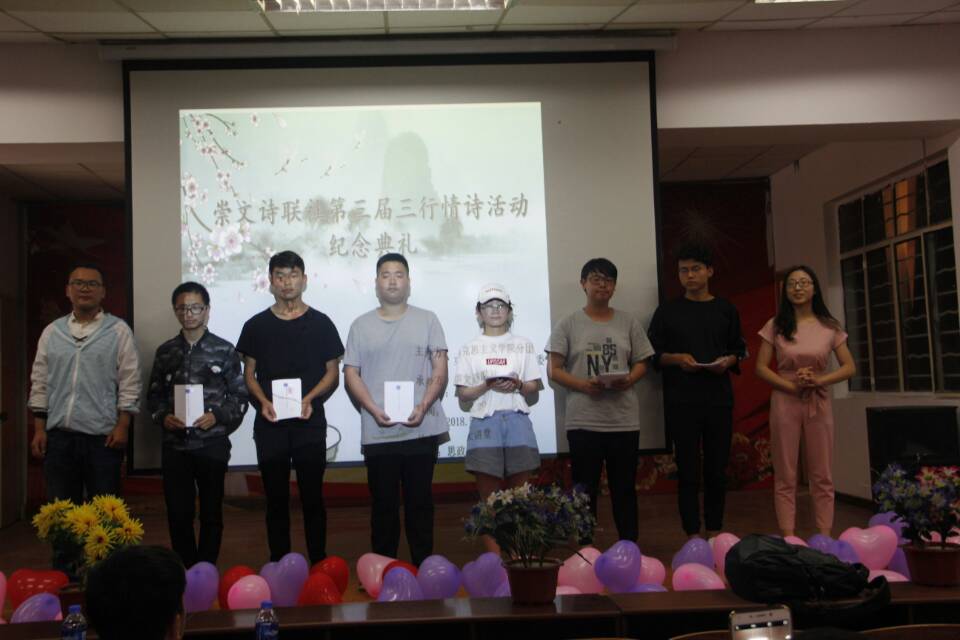 活动伊始,主持人公布入选人员名单;我社两名成员的作品也入选此次比赛,紧接着为入选作品的作者赠送了三行情诗作品集,赠刊结束后,崇文社联社为大家带来了优美的舞蹈凤求凰;在一次次掌声中把活动带向高潮,最后各社团在依依不舍中合影留念。这次活动圆满结束,取得了大家一致好评。