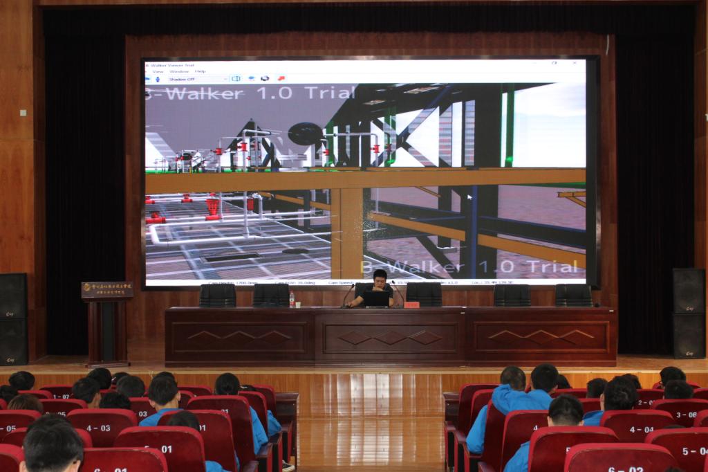 孟老师以“走近炼化装置工程管道设计”为题,为大家带了一场精彩的学术讲座。讲座期间,孟老师结合PPT,从炼油厂装置管道施工简析和炼油厂装置管道施工要点两大方面进行讲述。他讲道:1.炼油厂施工过程中管道装置施工一直是其重要的组成部分,而炼油厂装置管道施工的进行离不开关键点的有效支持;2.炼油厂装置管道施工是一项系统性的工作,这主要体现在了施工重要性、施工审查、施工准备等环节;3.对于炼油厂装置管道施工要点进行研究与分析具有极为重要的工程意义和现实意义。随后,孟老师为同学们展示了3D的化工工艺模型,让同学们更加深刻的了解化工工艺流程。讲座结束后,台下响起热烈的掌声。