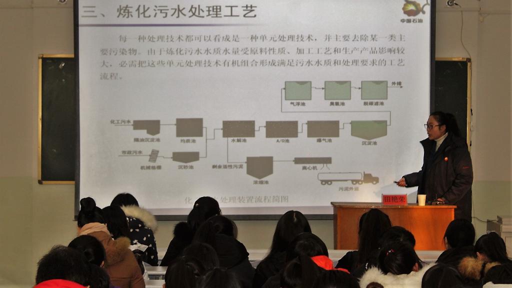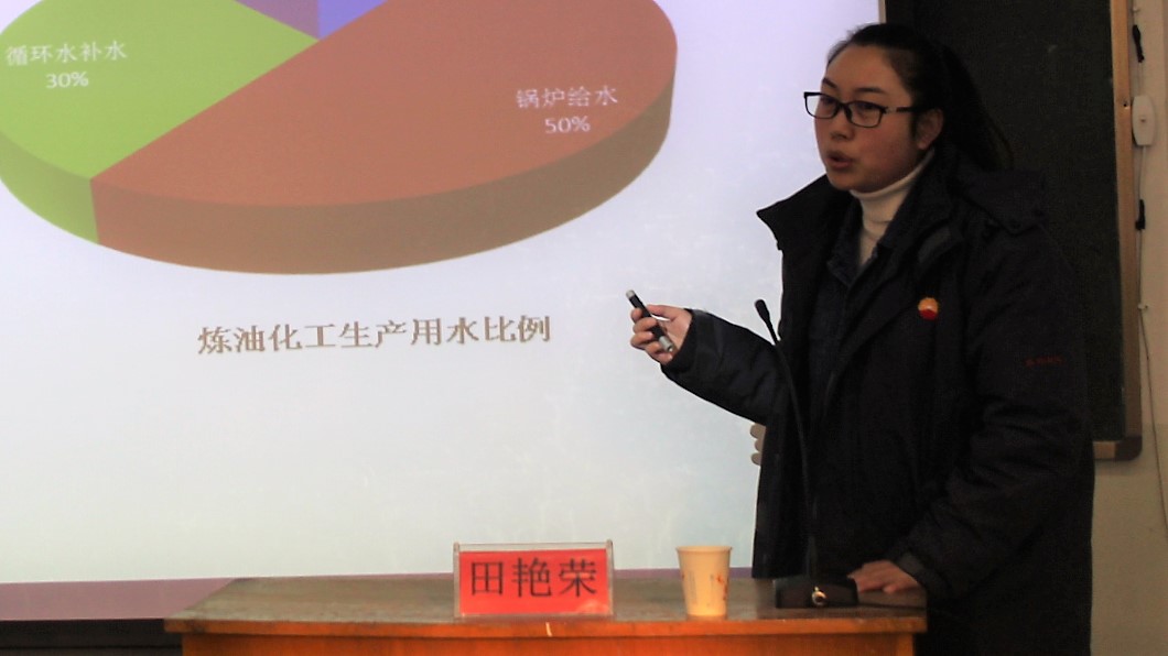 本次讲座共分为三个部分,田艳荣首先对炼化污水处理技术进行概述,说明午污水的来源、种类;讲述炼化污水的特点。第二,对炼油化工污水常用处理技术简介。讲述污水处理的三个级别;按工艺技术划分为6个工艺技术,并对其进行概述讲解。第三,炼化污水处理工艺。她用工艺流程图和文字对概念进行具体讲解,而后将此过程中所用的格栅、隔油池、均质池等文字和照片展示出,让员工清楚的了解炼化污水处理工艺步骤的每一细节。通过脱氮原理、碳氮比、生物相、污泥膨胀等知识详细讲解污水处理技术中生化的基本概念和生物处理的影响因素。让员工全面了解练化污水处理技术的每一步骤的重要性。