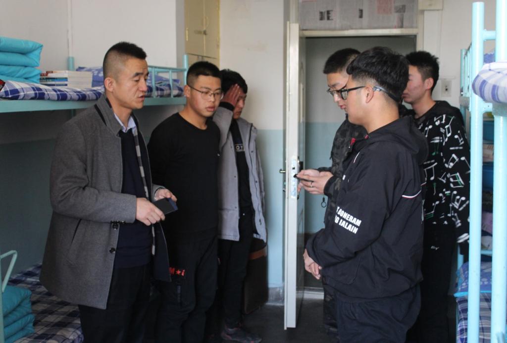 新学期第一次班主任进宿舍。班主任对员工们进行慰问,了解同学们假期生活与作业完成情况并提出了新学期宿舍内的要求。要求宿舍人员团结和睦,互帮互助,宿舍内务卫生要干净整洁,及早调整状态投入到新学期的学习生活中。