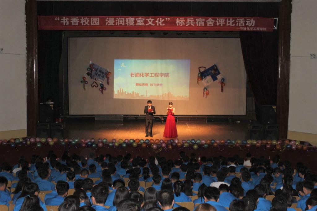 三是4月26日在西区礼堂举办了“书香校园,浸润寝室”标兵宿舍评比活动,举办“书香校园,浸润寝室文化”标兵宿舍评比晚会,活动伴随着主持人的报幕结束,各个标兵宿舍依次上台表演准备的才艺,选手们用自己的方式表达着对这次活动的重视性,表演的形式有跳舞,唱歌等,给观众们带来了一场绝妙的视听盛宴,台下时而爆发出热烈的掌声,全场气氛非常热烈。工分185班208宿舍和石化182班207宿舍分别带来的歌曲更将本次比赛推向高潮,共同摘夺了本次比赛的桂冠。辅导员李胜泥老师对本次活动进行了总结,他强调,“宿舍是我们的家,弘扬宿舍文化就是展现员工自身的文化素养”。最后伴随着员工们热烈的掌声,本次标兵宿舍评比活动圆满结束。