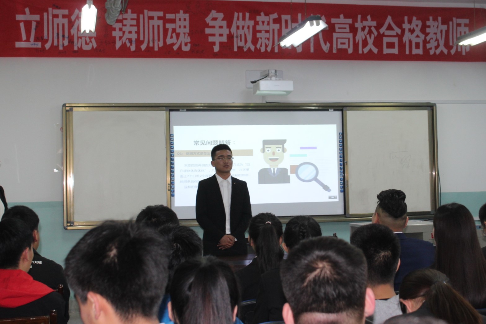 会上,刘拥军首先通过PPT的形式向员工们详细介绍了该企业的地理位置、企业文化和企业的发展前景。接着,刘拥军向员工们重点讲解了该企业在薪资待遇、社保福利、五险一金、晋升机制等一系列关乎员工们切身利益方面的规章制度。在会议中,在该公司就职的14级学长蒙晖还讲述了他在该公司的工作经验和生活经验,这让员工们更深刻更真实的了解了该公司的情况。最后,刘拥军又与员工们进行了简单的交流,帮助员工们更好的了解该公司。