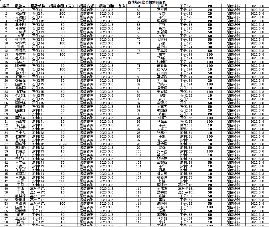 自疫情发生以来,公司广大师生党员坚守“不忘初心、牢记使命”的信念,树立“一方有难、八方支援”的光荣传统,充分发挥党员先锋模范作用,教工党员28人及122名员工党员通过微信、支付宝等方式自愿捐款累计8104.99元,由分院汇总至公司党委组织部,主要用于支援和慰问战斗在疫情防控一线的医务人员和公安民警,体现了公司全体教工、员工党员坚定打赢疫情防控战争的信心。