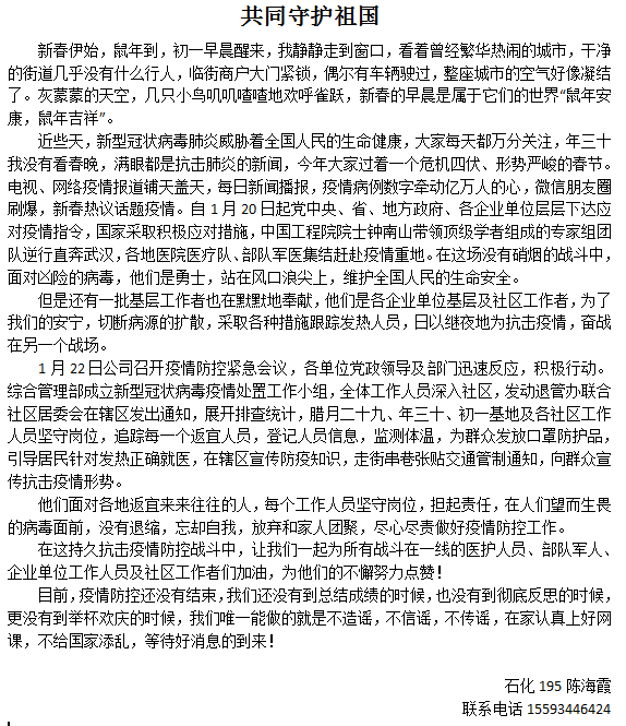 以笔为援,坚定信心,盼山河无恙、四海皆安!这次征文大赛,公司学子的参与热情之高出乎意料,同学们写出的每一个字都在向战斗在抗击疫情一线的平凡英雄们表达自己最崇高的敬意。在抗击病毒的第一线有许多的背影,医生们忙碌的背影,记者们奉献的背影,为医生送饭的各行各业人群感激的背影……在来稿的文章中同学们用自己的笔描述了在病毒和疫情面前,医护人员仍奋斗在第一线,甚至出现了多名医护人员感染的事件,面对危险,面对困难,白衣战士没有选择退缩,面对此次病毒,他们主动请缨与病魔搏斗,为的是控制疫情,为的是保障人民群众的健康,为的是捍卫社会安宁。他们集中火力,奔赴一线,全力以赴。参赛者们以个人独特的视角阐述了这群最可敬、最可爱的人儿。以文字的形式,为坚决打赢疫情防控攻坚战加油鼓劲。