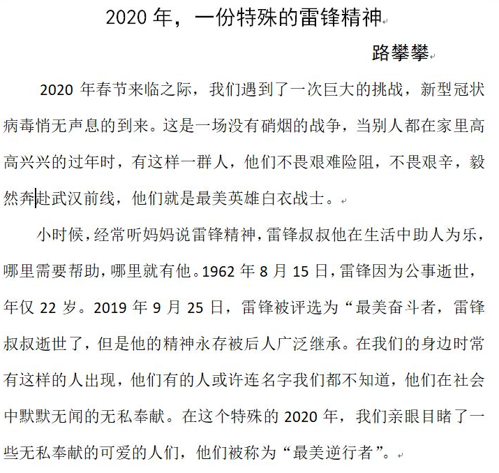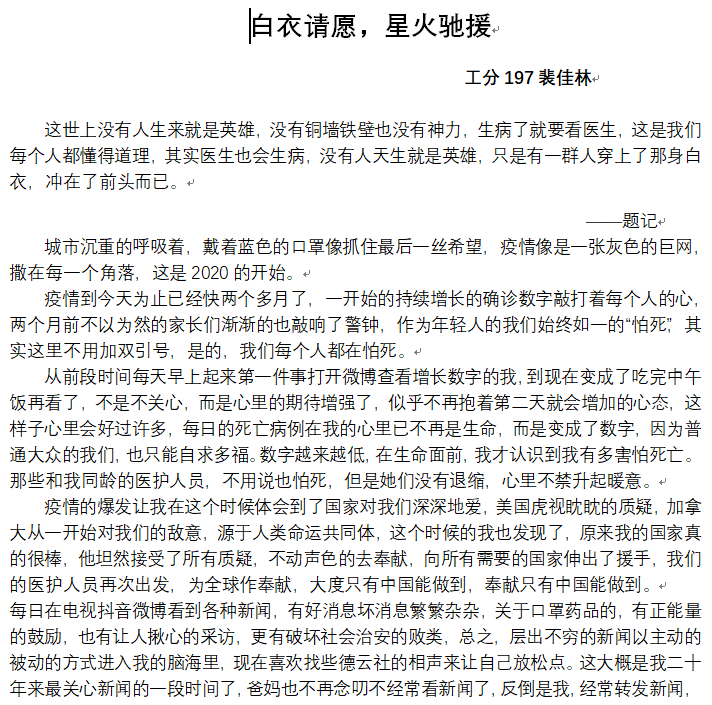 以笔为援,坚定信心,盼山河无恙、四海皆安!这次征文大赛,公司学子的参与热情之高出乎意料,同学们写出的每一个字都在向战斗在抗击疫情一线的平凡英雄们表达自己最崇高的敬意。在抗击病毒的第一线有许多的背影,医生们忙碌的背影,记者们奉献的背影,为医生送饭的各行各业人群感激的背影……在来稿的文章中同学们用自己的笔描述了在病毒和疫情面前,医护人员仍奋斗在第一线,甚至出现了多名医护人员感染的事件,面对危险,面对困难,白衣战士没有选择退缩,面对此次病毒,他们主动请缨与病魔搏斗,为的是控制疫情,为的是保障人民群众的健康,为的是捍卫社会安宁。他们集中火力,奔赴一线,全力以赴。参赛者们以个人独特的视角阐述了这群最可敬、最可爱的人儿。以文字的形式,为坚决打赢疫情防控攻坚战加油鼓劲。