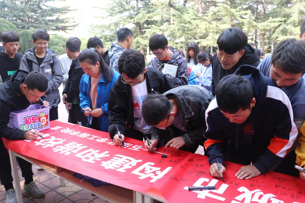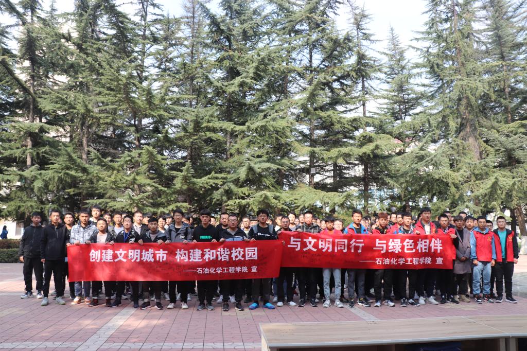 活动开始以后,由爱溢石化青年志愿者协会会长宣读倡导“与文明同行,与绿色相伴”倡议书。他为大家解读了爱护自然环境的重要性,鼓励同学们从社会、自然和科学等不同角度考察并理解环境问题,倡导他们积极参与解决环境问题的活动。并希望全体同学能够继承石化学子的优良作风。紧接着是活动的签字仪式,同学们在准备好的横幅上进行签字,现场秩序井井有条,寒冷的秋风也抵挡不了同学们对于参加活动的热情。