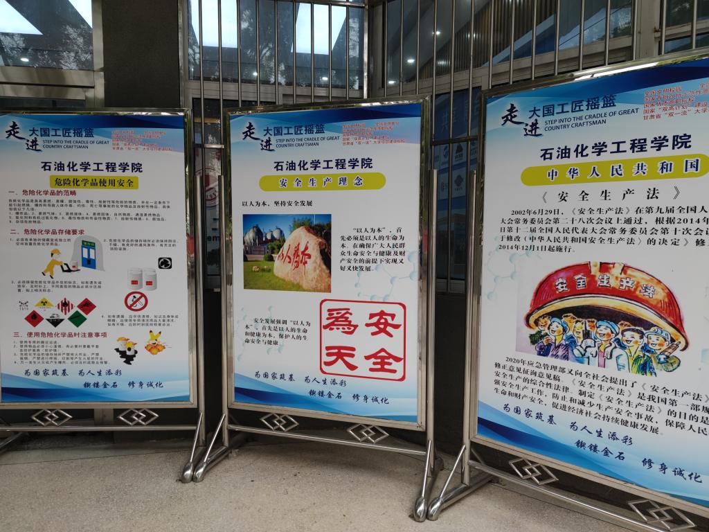 一是在校园主干路、实训基地、楼合门头等地多渠道、全方位的悬挂安全文化、安全生产等横幅标识,让安全倡议、安全警醒融入师生心田。二是设计制作以“安全生产法、安全生产理念、安全生产原则、安全生产方针、危险化学品使用安全、危险化学品安全管理条例、违章忠告”等为主题的宣传展板,把安全生产方针、理念、原则、法律法规等带入师生,教育引导员工对安全工作引起高度重视。
