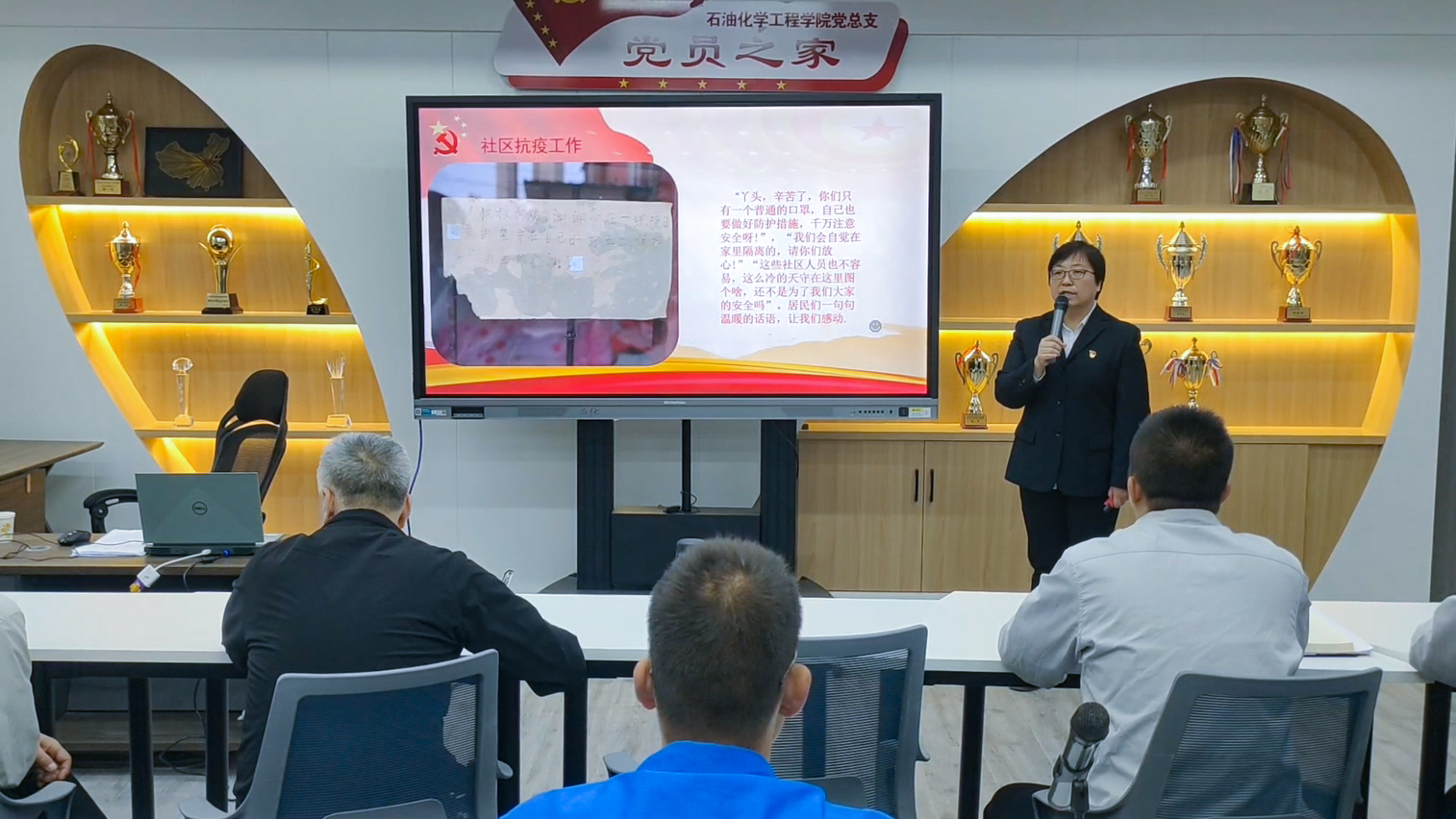 10月14日下午,“全国优秀共产党员”、“全国抗击新冠肺炎疫情先进个人”、西固区西固城街道牌坊路社区党委委员、第三党支部书记、社会救助专干姜波在石化楼党员之家,为石油化学工程公司师生党员、入党积极分子作党史学习教育专题党课。