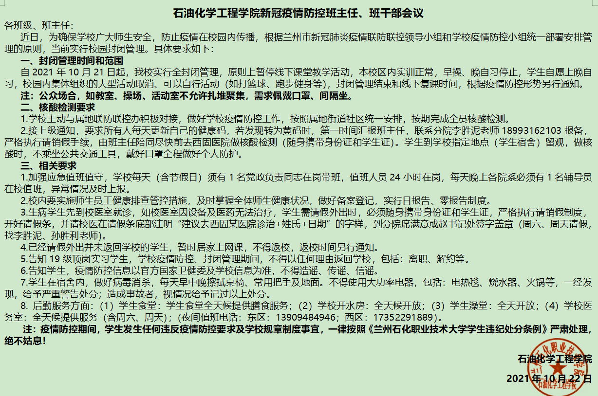 会上,赵立祥传达了公司疫情防控工作会议精神,通报了兰州市自10月16日以来疫情变化情况,分析了公司疫情防控工作面临的严峻形势。会议要求全体班主任落实好每日值班,深入公寓与员工谈心谈话,督促员工宿舍通风消杀,教育员工“不造谣、不信谣、不传谣”。同时要求全体辅导员班主任要做到“五个到位”:即思想认识到位、靠前指挥到位、履职尽责到位、措施落实到位、纪律执行到位。 最后席满意,对核酸检测、员工活动及具体事宜提出了具体要求。