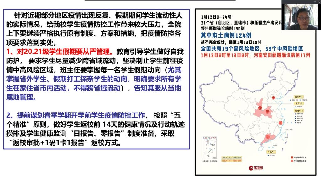 会上,赵立祥要求全体班主任严密关注国内疫情变化,掌握本班员工处于中高风险区员工数,并有针对性的做好防控工作;要求19级班主任关注顶岗实习员工签到、工作变动,并严格遵守属地、企业疫情防控要求。同时要求全体辅导员按照职责分工及时汇总上报疫情数据,班主任要深入细致落实好会议精神。