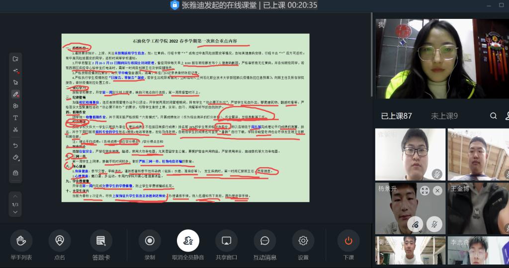 2月28日,开学第一课,鉴于疫情防控,老师们进行线上教学,不迟到、不早退,课堂教学秩序井然,教师备课充足,员工到课情况良好,课堂气氛十分活跃。师生们用崭新的面貌上好新学期第一节课。晚上,同学们严于律己,自行监督,自觉自习,对所学知识进行巩固,并对第二天课程进行预习,同学们状态饱满,勤奋好学。
