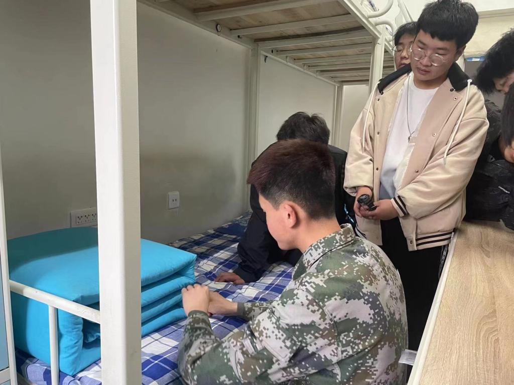 活动伊始,公司召开退伍老员工日常行为养成专项会议,鼓励同学们继续保持部队优良传统和军人优良作风,在做好自我管理的同时,发挥示范引领作用,积极创建良好的宿舍生活环境。退伍老员工与班级“结对子”,入班级、进宿舍,耐心讲解叠军被的要领和技巧,并向员工展示叠军被的流程与需要注意的细节,对员工提出的问题给与精确解答,以确保所有同学看的懂、学得会。随后,退伍老员工对各宿舍开展内务培训,现场展示叠被技巧和内务整理注意事项帮助22级员工尽快适应宿舍的规范化管理,也促使员工在日常生活中养成良好的内务卫生习惯。