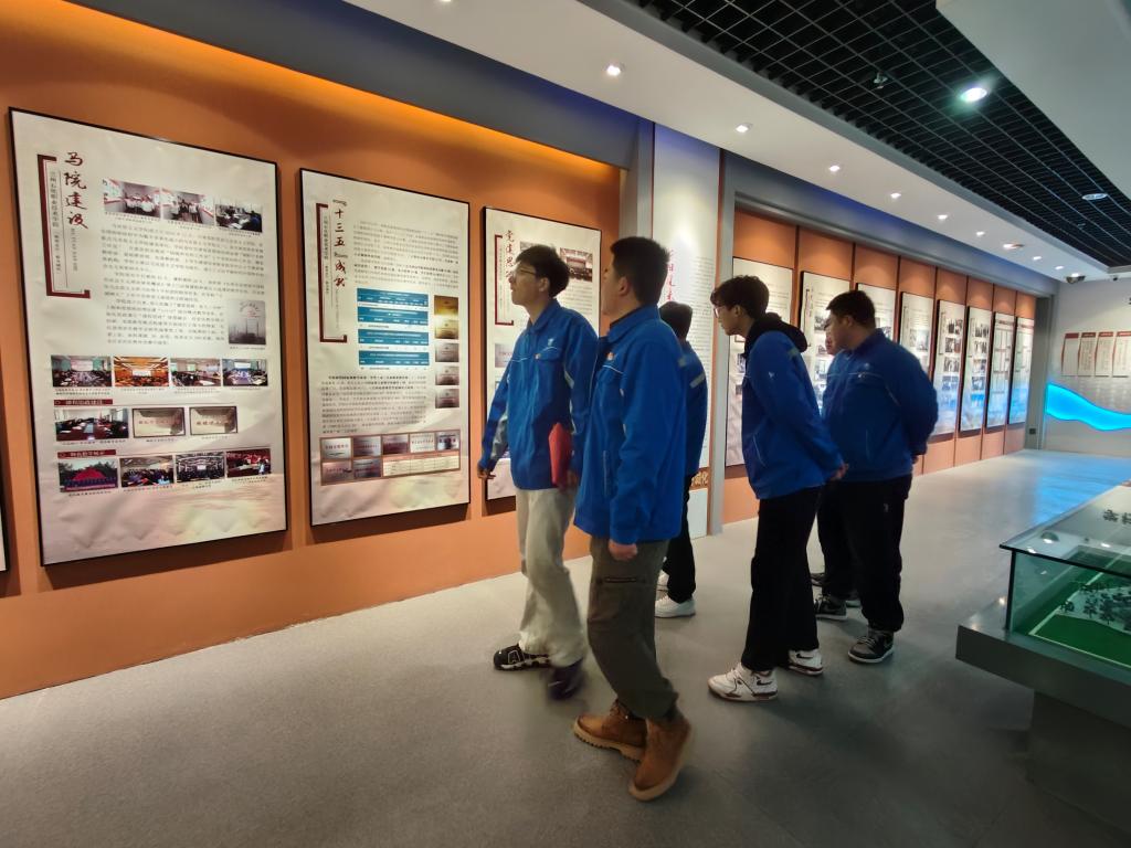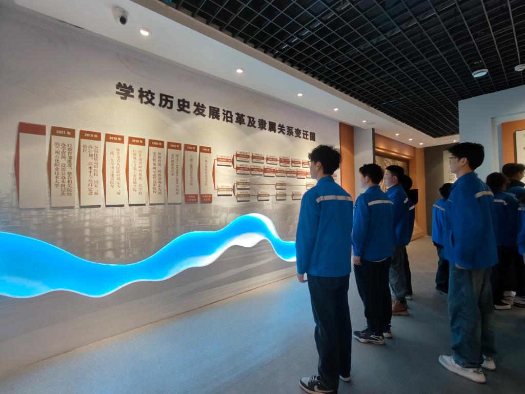 国以史为鉴,校以史明志。公司校史馆以实物、图片、文字、影像等形式展示了公司六十多年的办学历程与光辉成就。进入校史馆,同学们从“光辉岁月”部分开始,走过“今日风采”“工匠摇篮”和“金色名片”后,最终到达“再续华章”部分。同学们一次次驻足,用手轻轻抚摸着墙上具有时间印记的照片,重温了公司建校以来在专业建设、教学立校等方面取得的成就,浓厚的历史感让同学们感受到了公司自办学以来,数代石化人在“锲镂金石、修身诚化”的影响下,立足甘肃、扎根西北,为我国石油化工行业作出的突出贡献。走出校史馆,同学们一致认为身在石化大学无比幸福,强烈的自豪感油然而生。